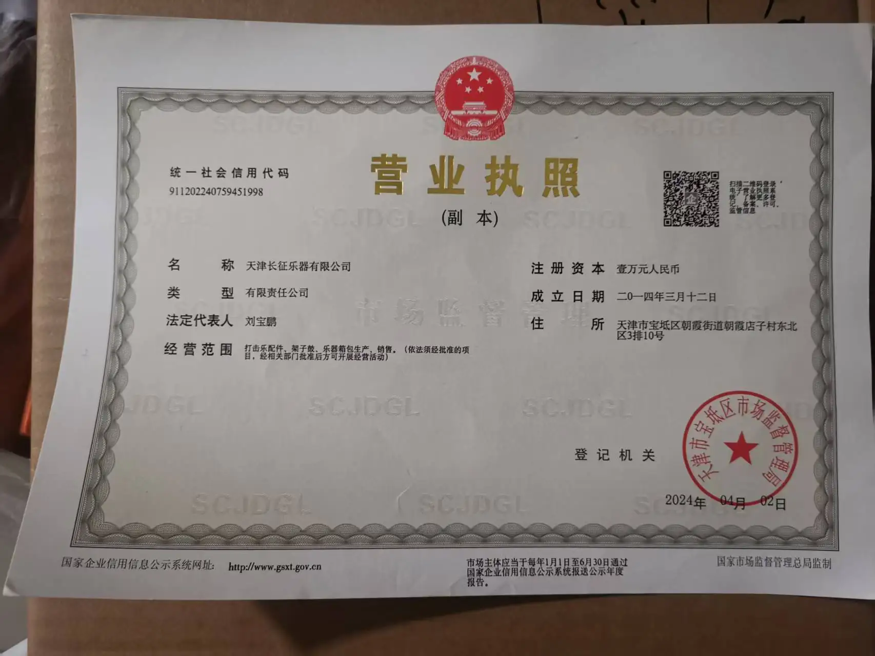 Registered address : No. 10, 3rd Row, Northeast Area, Chaoxia Dianzi Village, Chaoxia Subdistrict, Baodi District Tianjin China